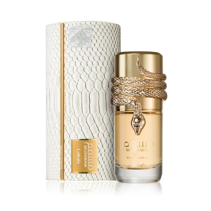 Musamam White Intense van Lattafa is een luxe en intens parfum met een verfijnde en krachtige uitstraling. De geur opent fris met bergamot, sinaasappel en kruidige noten. Het hart bestaat uit kokos, ylang-ylang, ambroxan en mahoniehout, wat zorgt voor een warme en sensuele diepte. De basis van sandelhout, musk en benzoïne geeft het parfum een langdurige en elegante afsluiting. Geïnspireerd op Stellar Times en perfect voor wie houdt van een exclusieve, warme en moderne geur.